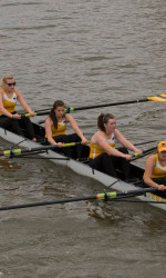 Following the Varsity 8’s, the Varsity 4’s raced. Minnesota had two crews racing and Iowa had one crew racing. The exact distances were hard to gage due to the position of the coaches launch on the narrow river. Both of Minnesota Varsity 4’s were ahead of Iowa by roughly a boat length of open water in the first piece and Minnesota finished ahead of Iowa by more than a boat length of open water in the second piece.