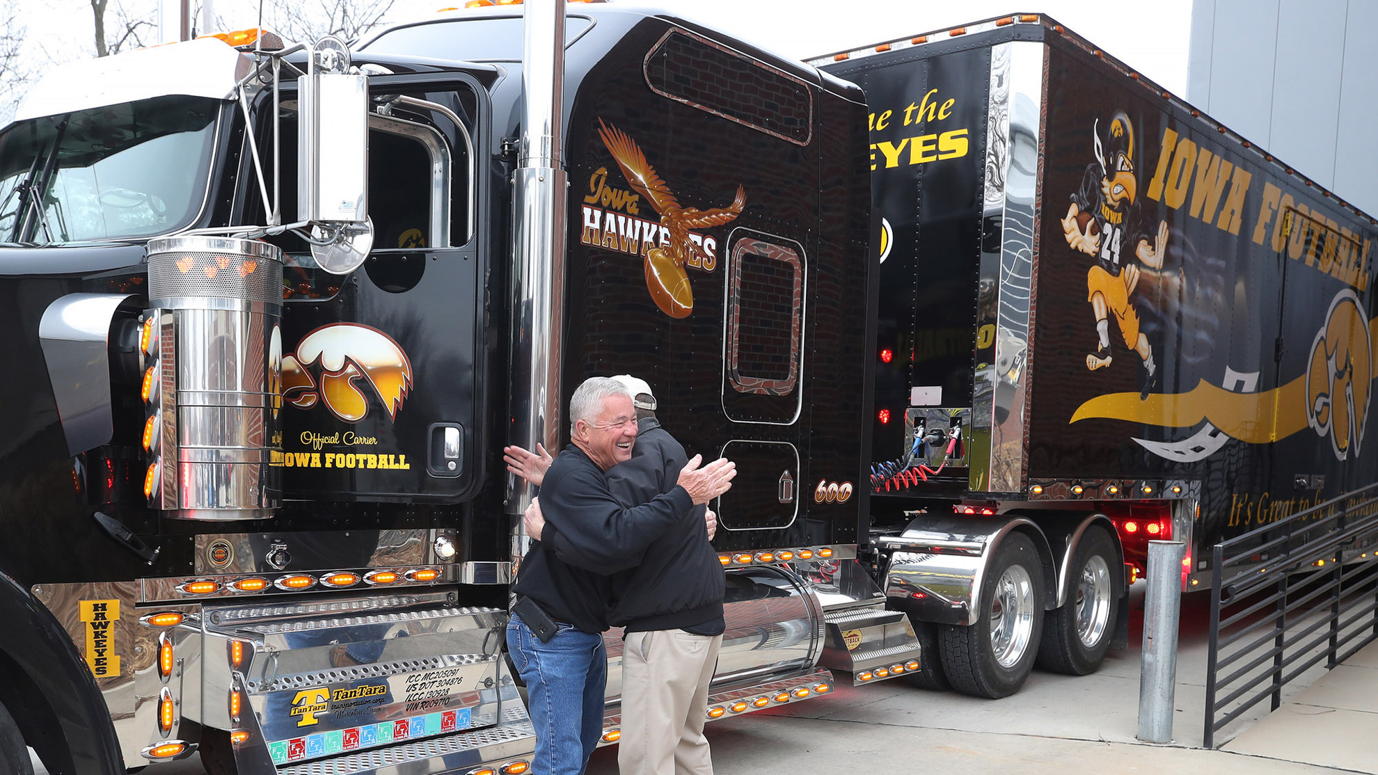 Riggan, founder of TanTara Transportation in Muscatine, Iowa, will make the haul solo. He will be behind the wheel of a 2007 W900 Kenworth with 108,000 miles — it’s only assignment for 12 years has been to transport University of Iowa football gear. The license plates read HAWKONE.