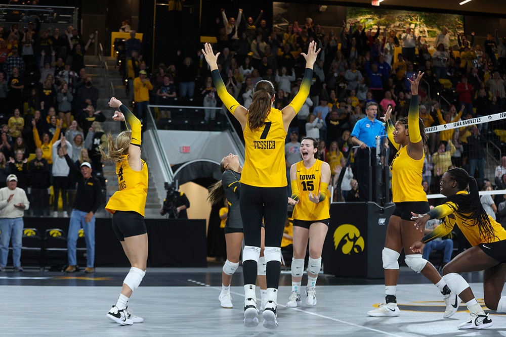 Iowa Hawkeyes middle hitter Delaney McSweeney (6), outside hitter Addie VanderWeide (22), outside hitter Toyosi Onabanjo (5), libero Mari Hinkle (10), outside hitter Michelle Urquhart (15), and setter Lily Tessier (7) celebrate after winning the fourth set of their match at Xtream Arena in Coralville, Iowa on Saturday, October 8, 2022. (Stephen Mally/hawkeyesports.com)