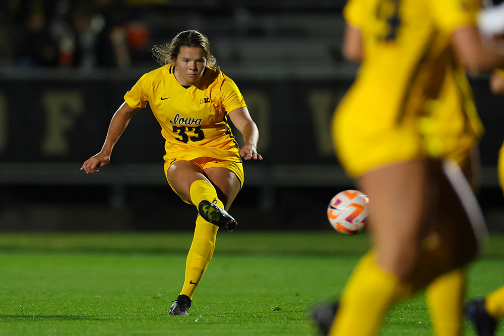 Iowa Hawkeyes midfielder Caroline Halonen (33) scores a goal during the second half of their game at the Iowa Soccer Complex in Iowa City, Iowa on Thursday, October 13, 2022. (Stephen Mally/hawkeyesports.com)