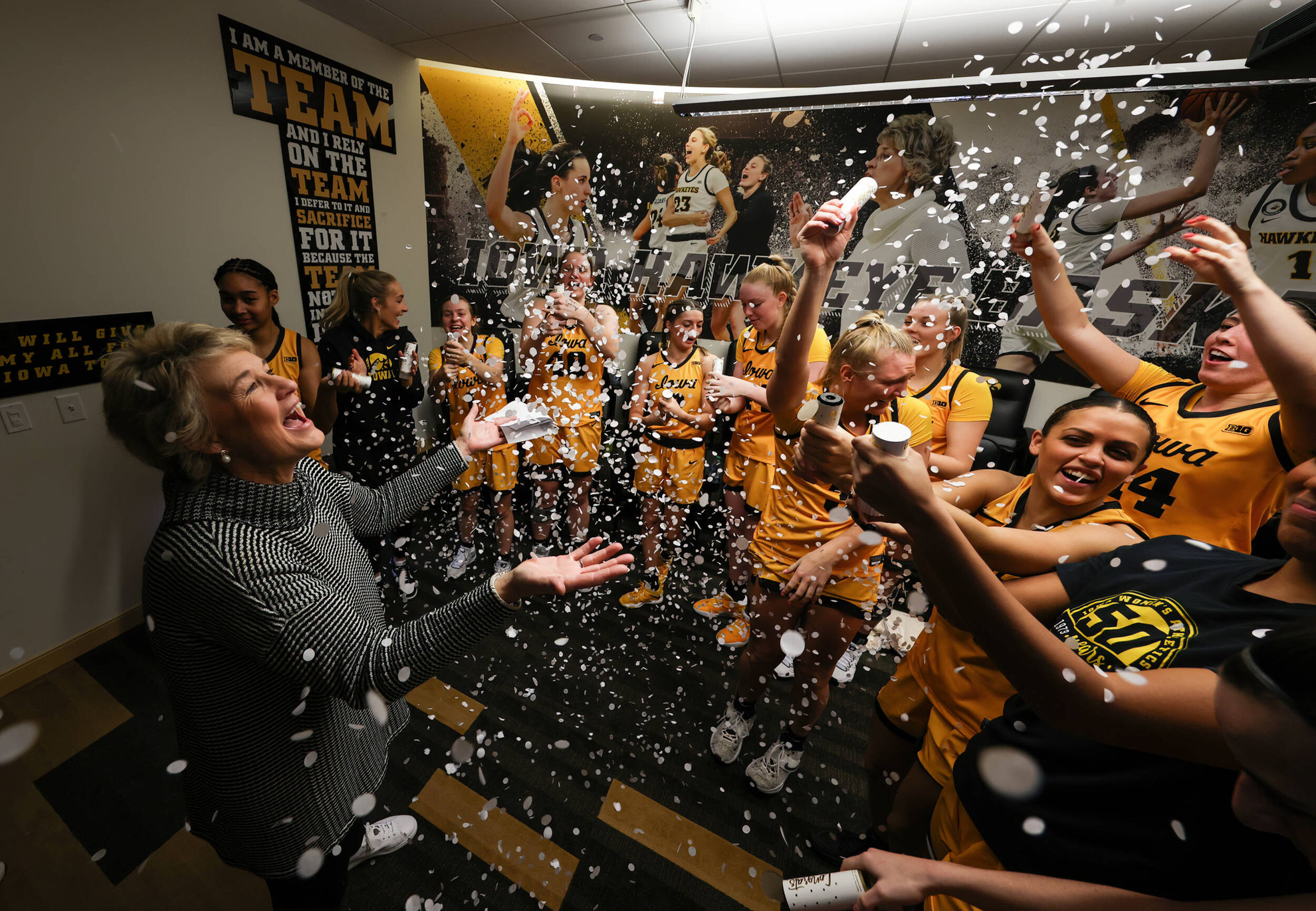 Iowa Hawkeyes head coach Lisa Bluder celebrates her 234th Big Ten win with her team following their game against the Minnesota Golden Gophers Saturday, December 10, 2022 at Carver-Hawkeye Arena. (Brian Ray/hawkeyesports.com)