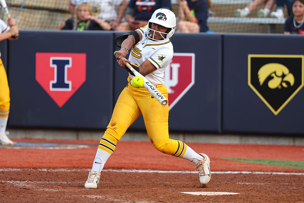 Iowa Hawkeyes outfielder Tatianna Roman (9) bats during the fourth inning of their game against Maryland in the first round of the Big Ten Softball Tournament at Eichelberger Field in Champaign, Illinois on Wednesday, May 10, 2023. (Stephen Mally/hawkeyesports.com)